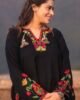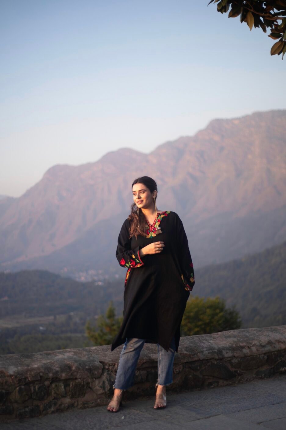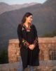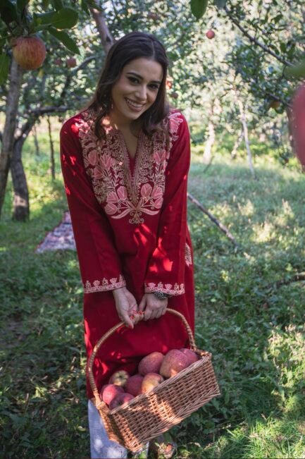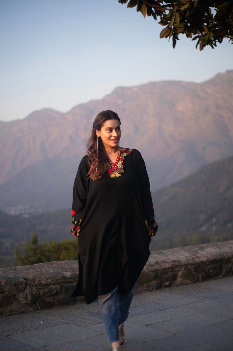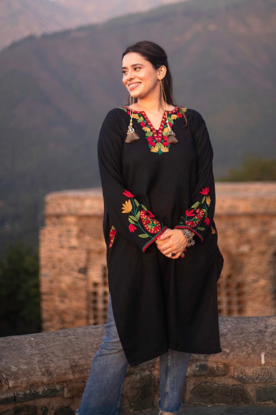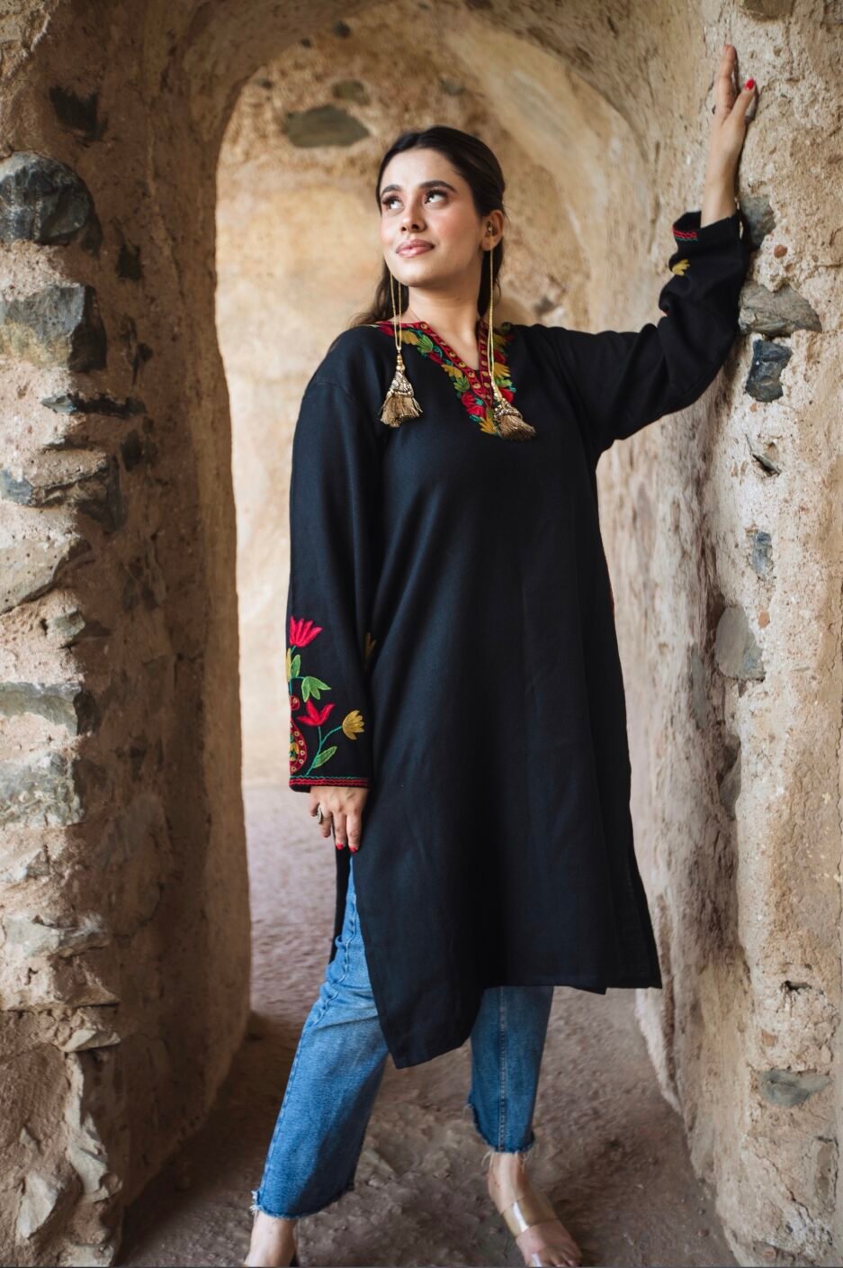 A timeless beauty from the valley, this hand-embroidered black pheran stands out with vibrant threads of red, yellow, and green. Inspired by lotus blooms and paisley motifs, it beautifully blends bold tradition with modern elegance — a statement piece for every season.
