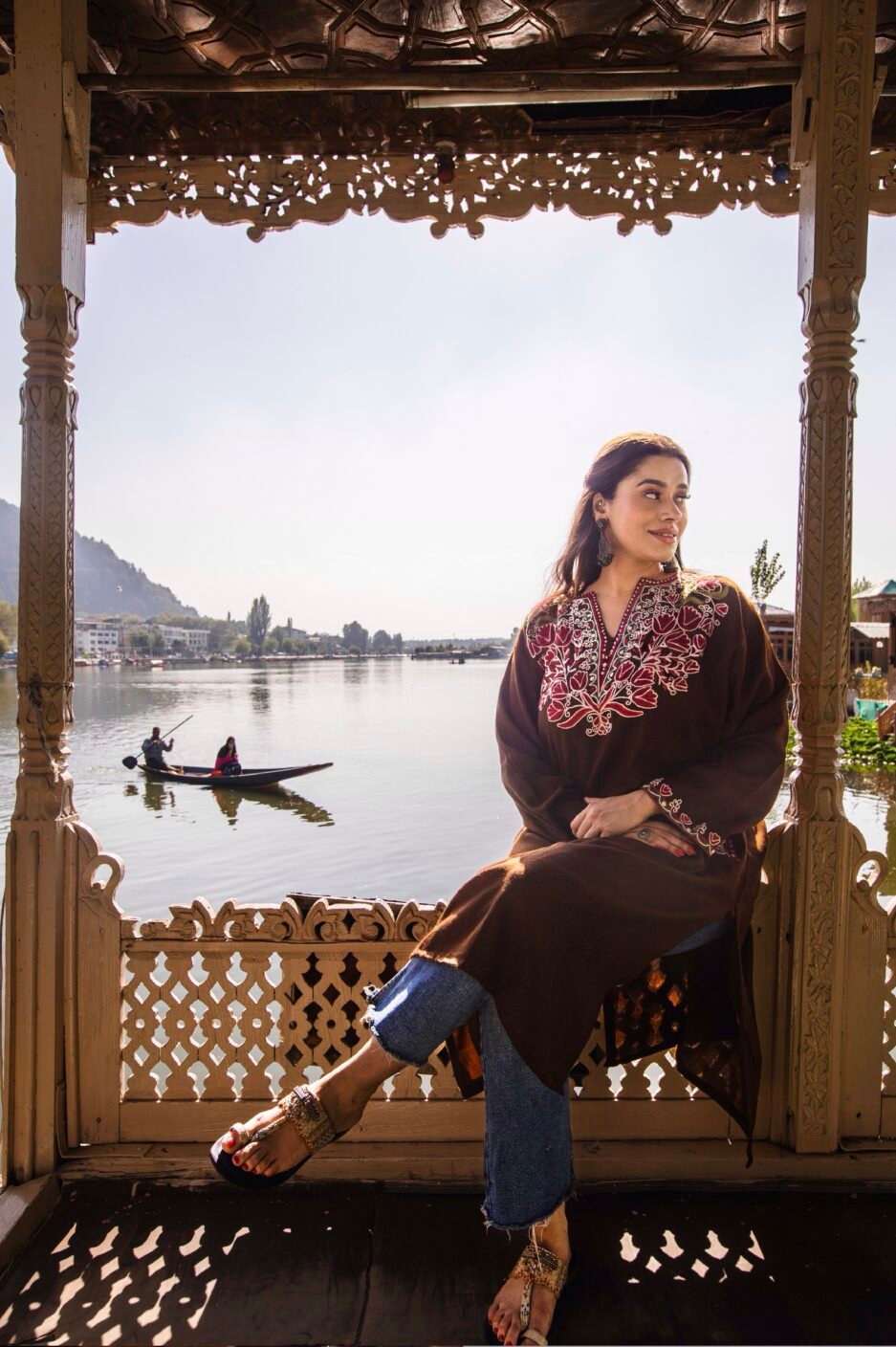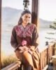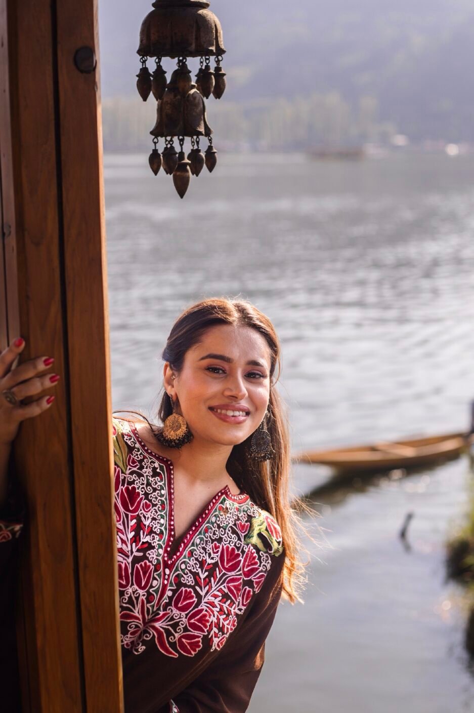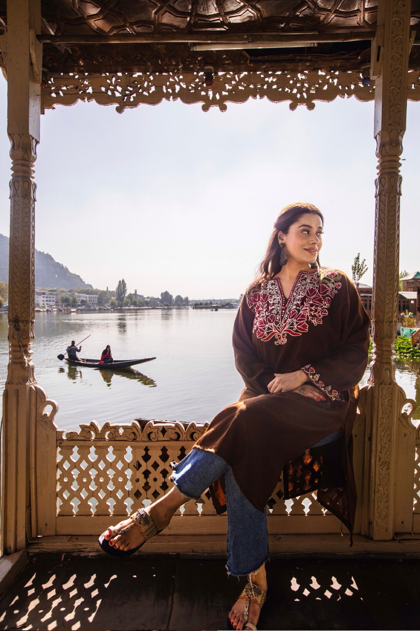 Hand embroidered by the valley’s skilled artisans, this piece carries the warmth of earth and tradition. Intricate motifs in white, red, and hints of green adorn the mocha base, creating a subtle yet captivating contrast — a perfect blend of elegance and heritage.